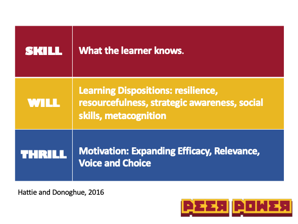 In smaller groups, Paul helped us to understand how this connects to learning dispositions and how we can support transfer skills. He talked about skill, will, and thrill. Learning is the skill of what we are doing (schools do this really well). Will is the dispositional learning and thrill is the student voice and choice. When these three things are present, then skills are developed that will transfer.